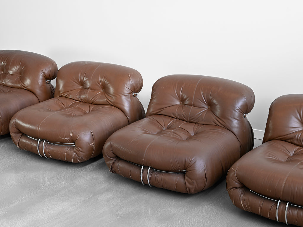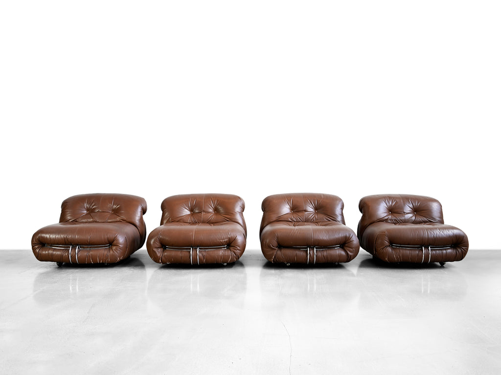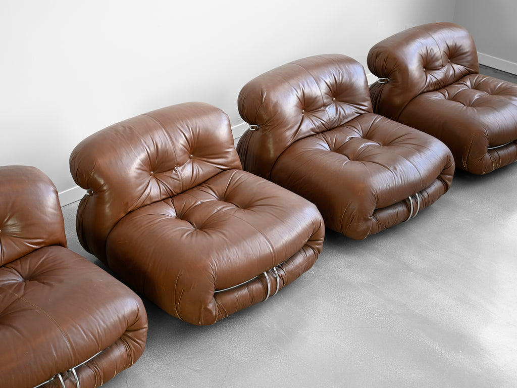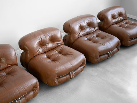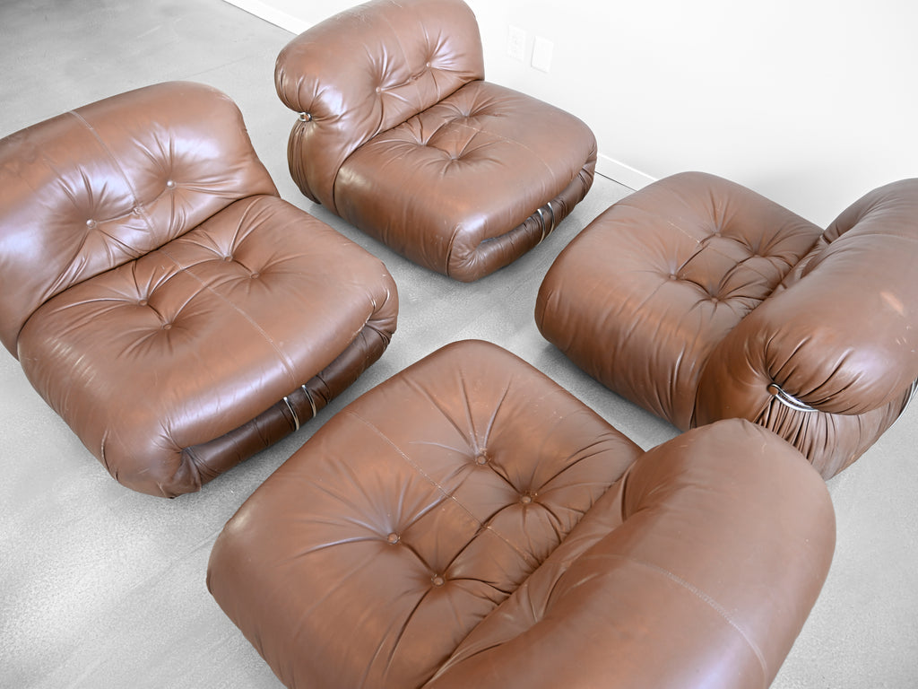 Vintage set of four brown leather Soriana lounge chairs designed by Afra and Tobia Scarpa for Cassina. Original Cassina labels affixed to the underside of each chair.