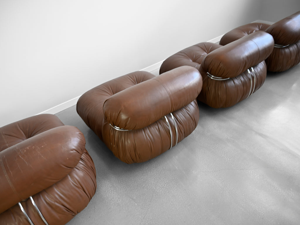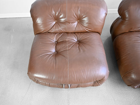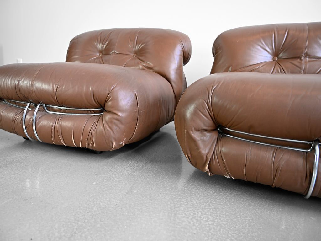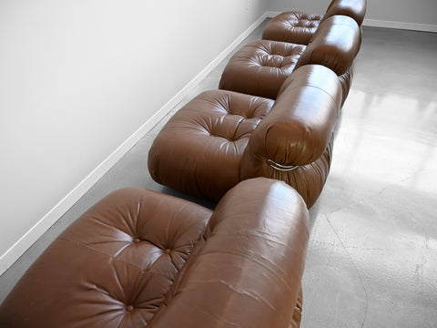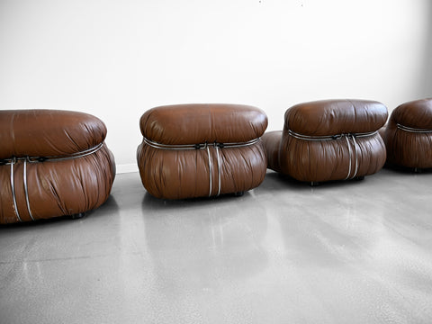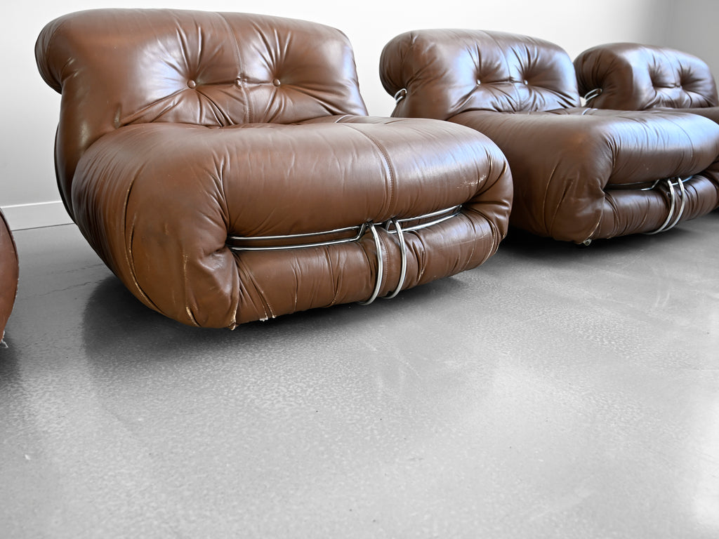 Vintage set of four brown leather Soriana lounge chairs designed by Afra and Tobia Scarpa for Cassina. Original Cassina labels affixed to the underside of each chair.