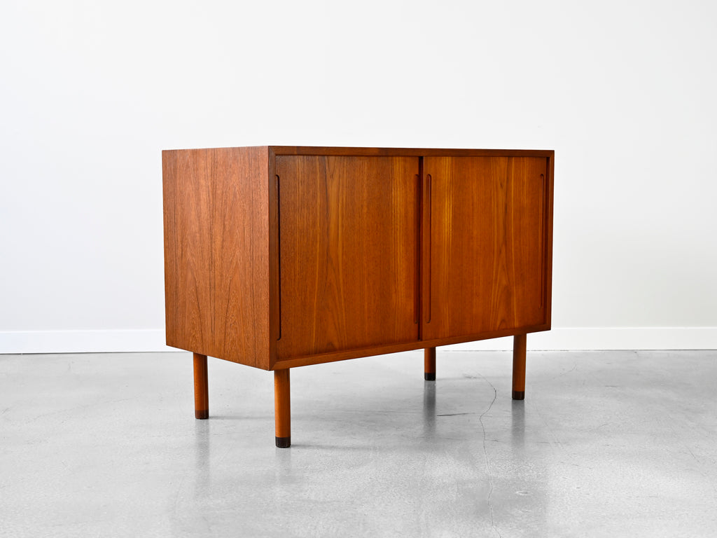 Vintage sliding door cabinet in teak by Hans Wegner for RY Möbler. This model hails from the RY100 series and features rosewood capped feet and two storage bays with a total of 3 adjustable shelves.